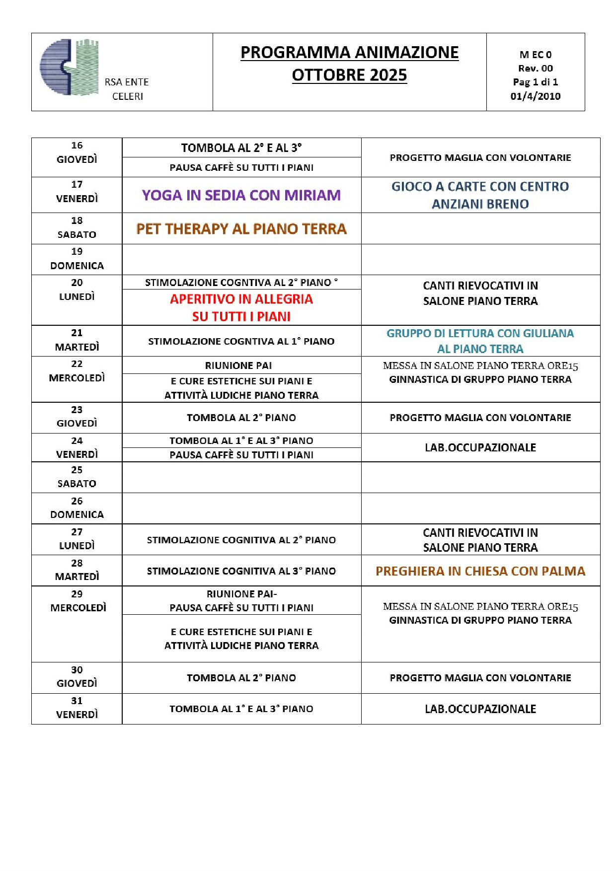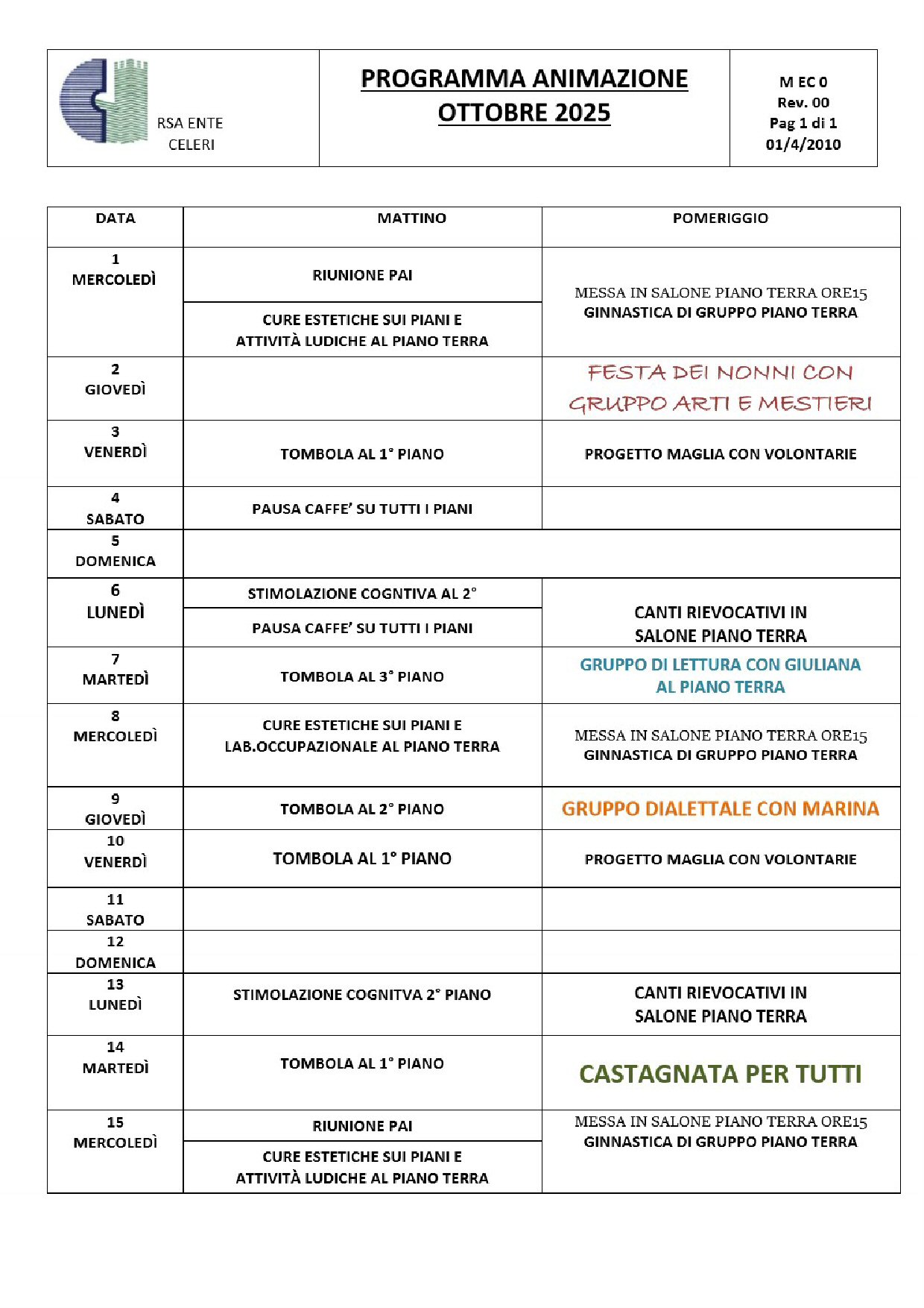 "Gioco della Tombola", "Canto in compagnia", "Pausa Caffè", "Attività manuali e cognitive", "Spazio bellezza" etc. si intervallano ai momenti conviviali e di festa che nascono durante il passare delle stagioni.