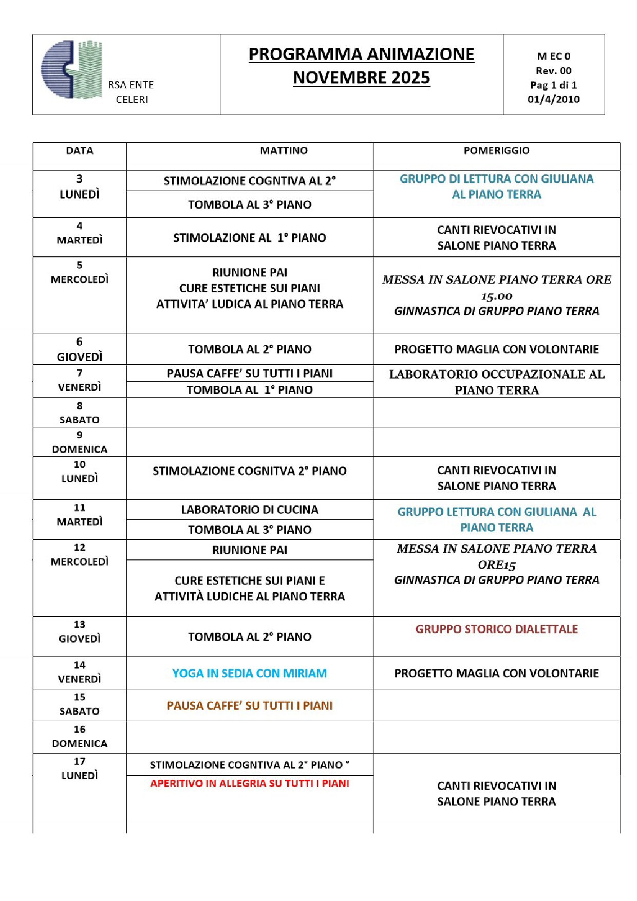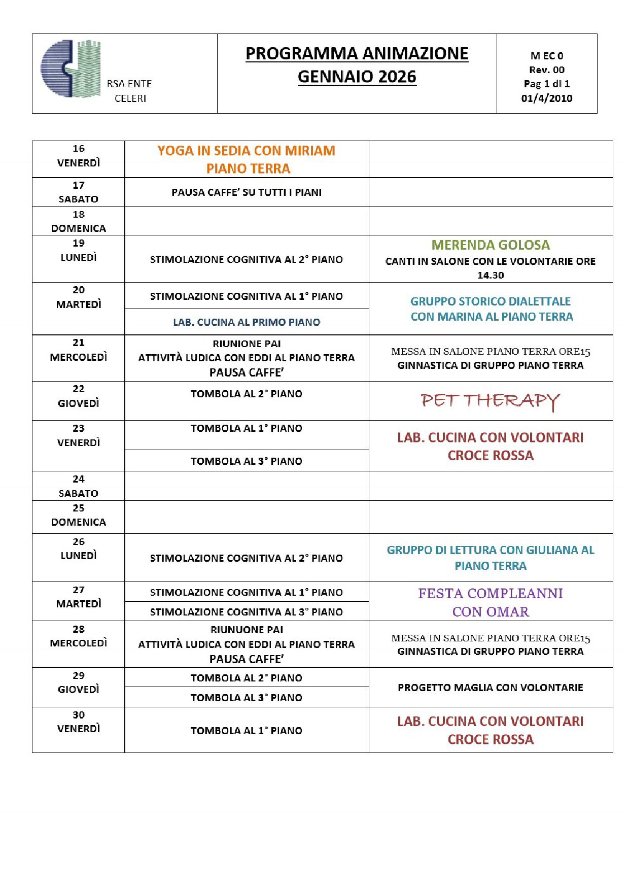 "Gioco della Tombola", "Canto in compagnia", "Pausa Caffè", "Attività manuali e cognitive", "Spazio bellezza" etc. si intervallano ai momenti conviviali e di festa che nascono durante il passare delle stagioni.