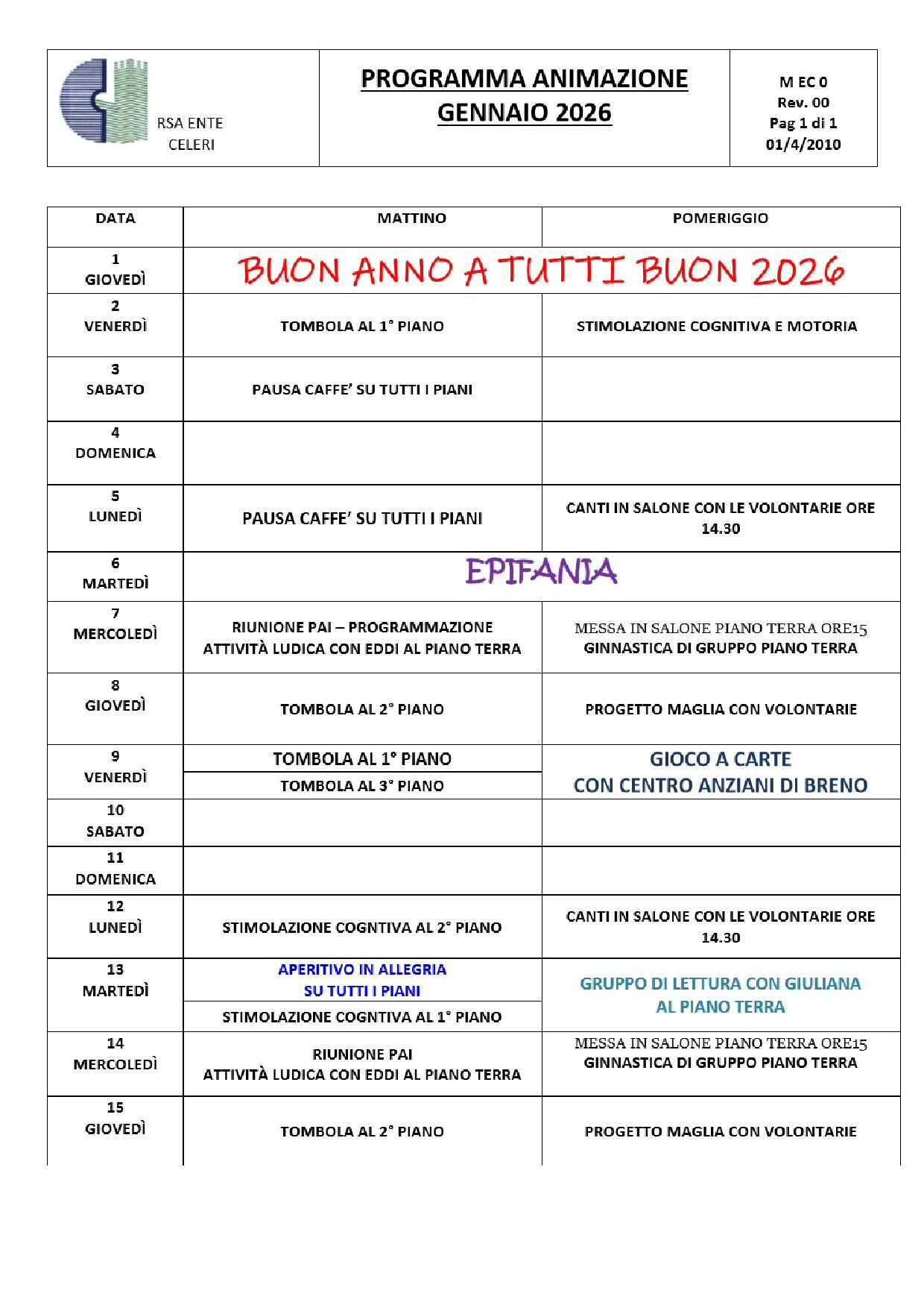 "Gioco della Tombola", "Canto in compagnia", "Pausa Caffè", "Attività manuali e cognitive", "Spazio bellezza" etc. si intervallano ai momenti conviviali e di festa che nascono durante il passare delle stagioni.